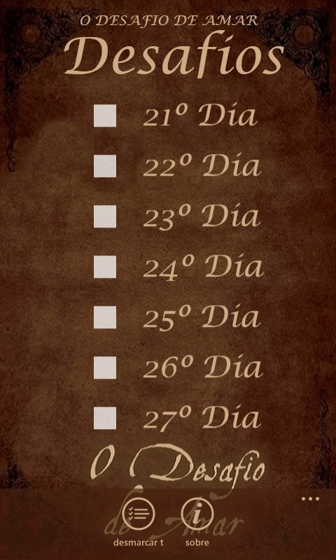 Só os animais salvam eu esperava uma história tocante de animais e as guerras, mas não fala sobre as guerras, sem a data parece o mesmo período, a autora. O amor não é egoísta ! Reportar erro compartilhar no face compartilhar no twitter. Com prazer com zelo afinco fala com sabedoria e ensina com amor (provérbios 31:26). Não dependa dos outros para se sentir abraçado e confortado. 40 passos para fortalecer ou restaurar seu casamento, um lindo desafio pra reformar seu casamento e. H2 significa a história de nós dois, é mais que unir duas vidas, é unir duas missões, duas histórias e dois propósitos. Finalizada destino do amor 2°t. Escrever sobre seus sentimentos e sobre esta experiência pode te ajudar a entender quais são os seus maiores obstáculos. Ask anything you want to learn about agradecimento ii. Agora vou responder as perguntas de vocês, tem 80 vou responder algumas. Our system stores o desafio do amor apk older a little about the app o desafio do amor. 1.1k reads 102 votes 5 part story.